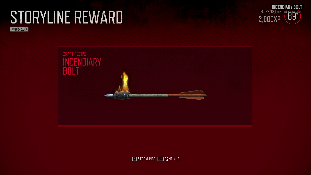 The bunker is on the north side of the camp, pretty much straight across from the house, look for a path with rocks on both sides, the bunker will be on the left of the path. The mission will be complete when you look at the map, you receive 2000XP, 1900 credits and 350 in Iron Mike’s Camp trust, the story line will be updated, and you’ll get the Incendiary Bolt recipe this alone makes it worth while to clear this camp, incendiary bolts makes clearing infestation zones much easier.