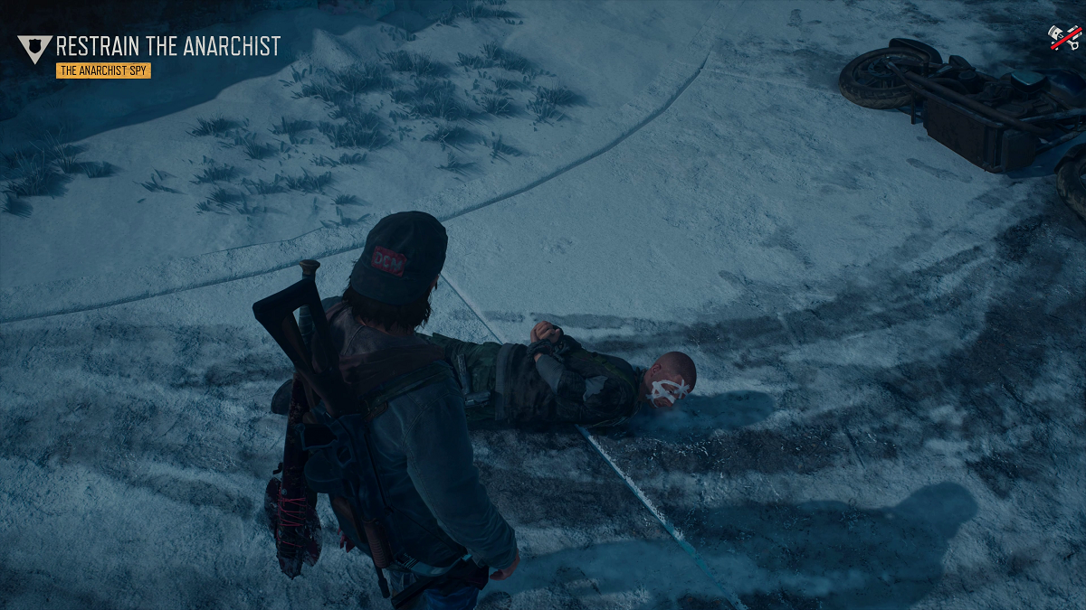 Your first objective is to locate the Anarchist, the area to search is in the northeast snow covered part of the map, in the same area where the Just Doing My Job mission took place. There are a few ways to get to Hwy 97 region but if you go through the tunnel at the Checkpoint turn right at the stop sigh and stay on this highway until you see a red dump truck then turn right into the Kerr Valley Recreation Area. The search area is in the cabin at the bottom of the hill, before you search the cabin make sure you have enough gas and ammo for the chase. Once you search the cabin the Marauder rides by trying to escape. I should’ve went to my bike right away instead of collecting loot and not given him such a big head start. It would be easier if you get him before he enters the sky lodge where there’s all kinds of vehicles and tight spots to maneuver around. It took me to just in front of the lodge to stop him, but in the process I crashed and my health was pretty low, so I just made it. When the Marauder is down a cut scene will play, Deacon and the Marauder have and exchange of words, when the cut scene ends the mission will be complete. This one pays 5000XP, 3500 credits, 1800 in camp trust points, and if you’ve been doing the Bounty Hunter mission from the start of the game this one will be the last. The Bounty Hunter story line will be complete and you’ll unlock some custom skins, in particular the St. John Bounty Hunter Custom Accent.
