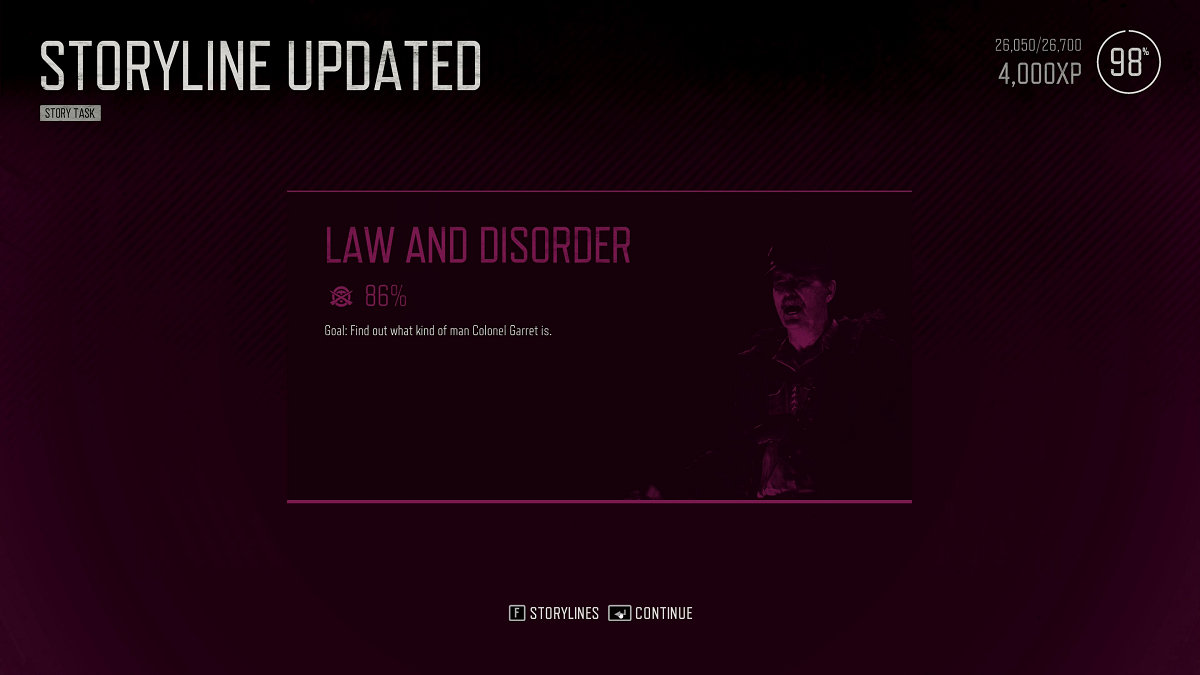 All that’s required is to go to the staging area and listen to Colonel Garret’s speech. In his speech he announces the Sarah and Weaver were placed inside the ark for “protective custody” so the Colonel is becoming unreasonable. So this is just to advance the story of the game, anyway it’s also free XP for this one you’ll get 4000XP, 350 credits, 1000 camp trust points, and the Law And Disorder story line will be updated.