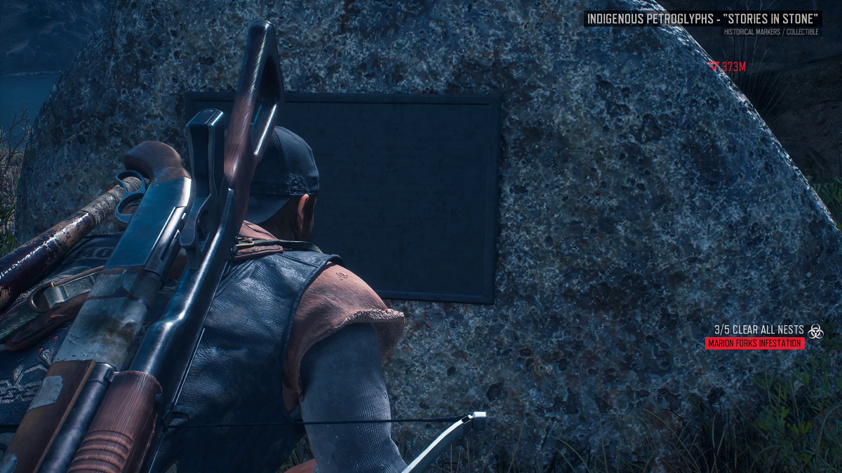 The historical marker is a little further down the road on the left, this one is for Indigenous Petrogyphs-” Stories In Stone”. Just past the marker on the right is a hoard cave with a searchable area on the road near the entrance. After you examine the corpse a trail of very light foot steps will appear that will lead to a small camping area on the shore where there’s 2 Freakers milling about. Since you have to take these Freakers out to investigate the area it’s best to use your cross bow so that by the time they reach your position there will only be one or none to deal with.