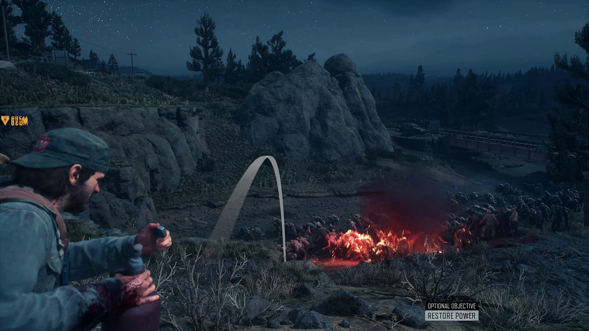 If you arrive at night the horde will be out at the waters end down the hill from the checkpoint. I had to use a different strategy for this horde because although there were bushes around they were all too small and too far away. I tried to lure them closer but I couldn’t get them to all come together, so I had to take a more aggressive approach. I was using the Chicago Chopper as my primary weapon and I had 3 refills in my saddle bags. Instead of trying to hide and hit them with molotovs I went down the hill far enough so I could reach a big enough group and threw 4 napalm molotovs by the time done part of the horde started to chase me. I ran past the pickup on the bridge that’s close to the rail and used that as a choke point, the majority of Freakers will come through there instead of going around. Eventually the Freakers will stop coming so you’ll have to coax another group to come up. The second time I went down I used molotovs, there was only time to throw 3 before I had to run back to the choke point. I should’ve been standing farther away to give me time to reload. I had to go down a third time with three more molotovs but that didn’t attract much attention so I hit them with pipe bombs. After that the horde was small enough to start shooting the rest, at one point I ran out of ammo and had to run back my bike to restock. I don’t know how much XP this horde will earn you but it’s probably in the neighborhood of 400, but you’ll earn 1700 credits, 1650 in camp trust points, and the Horde Killer story line will be updated.