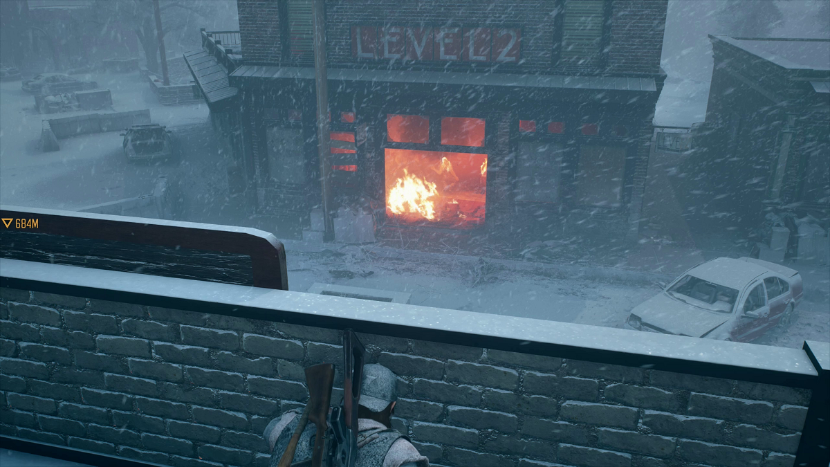 Travel to Sherman’s Camp and enter it at the gas station end the one off of Roberts Bridge Rd and park your bike at that end of the camp somewhere. The horde is in the Level 2 building, across the road is a clothes store that has a ladder in the back that will get you onto the roof. There’s a med kit and a Molotov on the HVAC unit, there is a section of brick wall and the store sign that provide good cover. It was snowing on the day I made this video but you can just see the horde inside the Level 2 building. I used 6 Molotov cocktails and 3 pipe bombs, after all that I still had 1 Freaker to take out. The horde didn’t know I was up there so this is one of the easier hordes to Kill, it pays 3000XP, 1900 credits, 600 point gain in camp trust, and the Horde Killer story line will be updated.