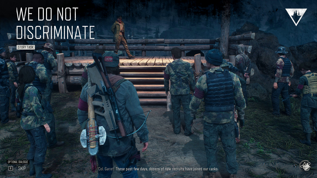 The other mission is called We Do Not Discriminate and all you have to do is listen to Colonel Garret’s speech. The dialogue is optional so if you don’t want to hear what he has to say you can skip to the end. This one pays 4000XP, 350 credits, 1000 in camp trust points, and the Law And Disorder story line will be updated.