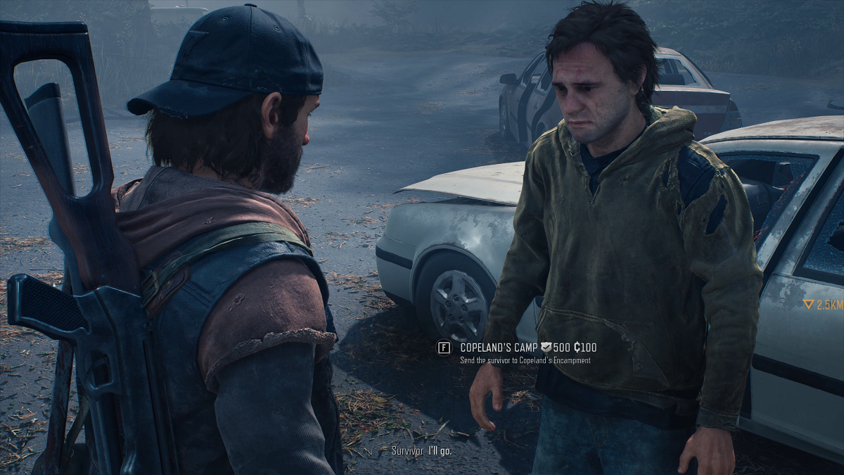 I continued along the edge of the cemetery until I could see the cars on the interior cemetery road. Sometimes there will be someone who needs rescue from Freakers as it was in this video. You’ll have to clear the area of Freakers before the individual can exit the car. When you’ve cleared the Freakers and approach the car he’ll come out. When you talk to him you can send him to Copeland’s camp and earn some trust and $100.