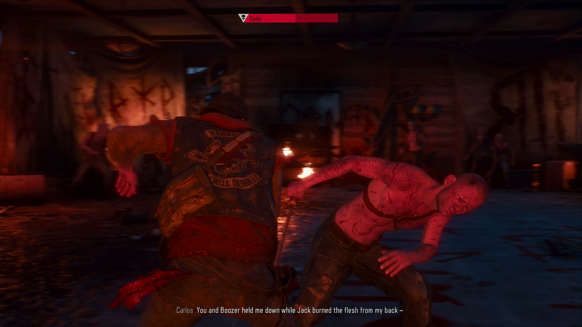 The only weapon you’ll have is your boot knife, as soon as the game starts after the cut scene Carlos will run at you so you have to duck out of the way or you will die. After you dodge his attack strike him 3 or 4 times, he’ll attack so dodge do another combo of 3 or 4. The control is a little weird but I guess it’s supposed to be that way. As long as you can dodge his attacks you’ll be successful. When Carlos is down a cut scene will play, when it ends Deacon will be outside again with Boozer.