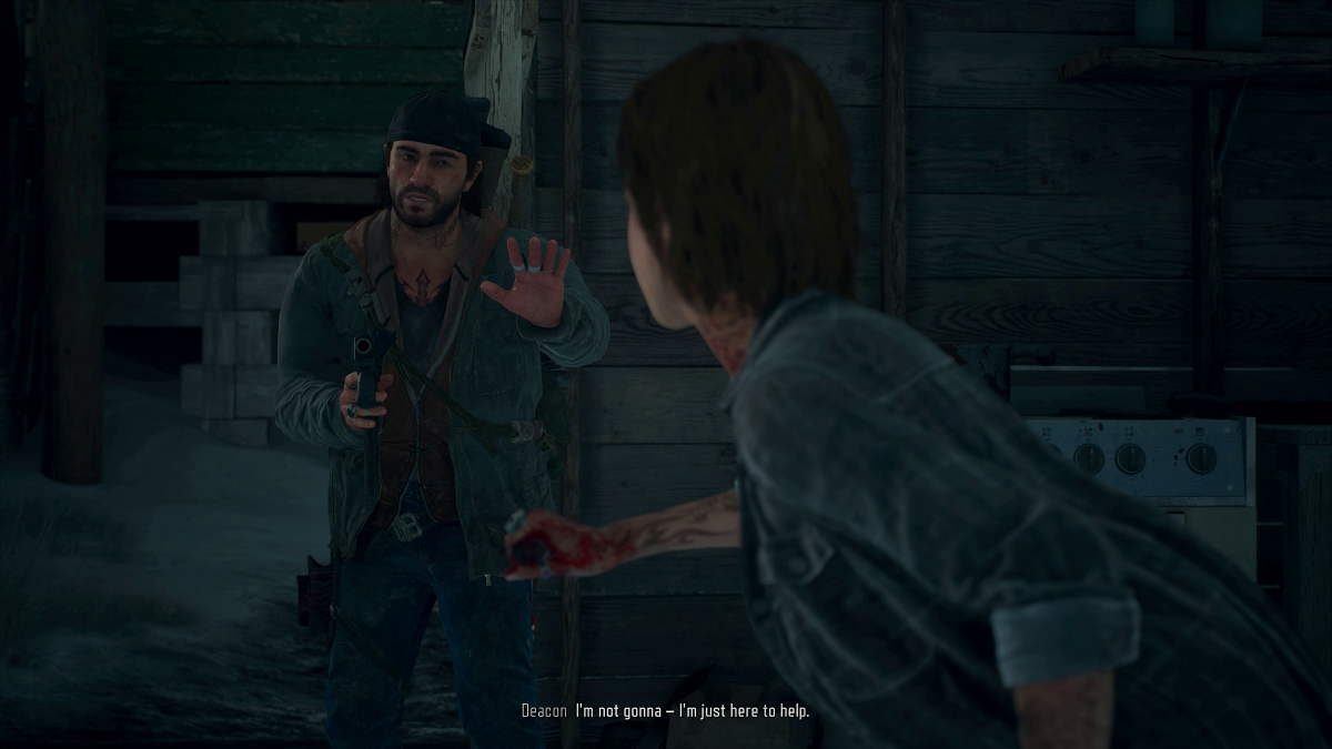 The objective here is to track Vasquez, a recruit that’s gone awol. Start in the cabin, your search will turn up some stolen rations on the bed and a dog toy on the floor, there’s also loot in the bathroom and kitchen. Leave through the back door, straight ahead you’ll see the broken fence. Follow the pieces of cardboard, eventually you’ll arrive at an area to search which reveal tracks but they are hard to see, I went the wrong way a couple of times but if you keep to the left you’ll come upon a wolf eating a carcass. You’ll get a new objective to clear the wolves, there’s only one but three more will show up. After you collect the wolf meat search the carcass, this time your search reveals what looks like hay on the ground to follow which is much easier to see. The trail leads you to another carcass, ammo on the left and a med kit with the backpack. Continue straight ahead and eventually you’ll arrive at a mass grave location and your first look at the hordes in Crater Lake. A new objective appears to follow Captain Kouri, he’ll stop to look at the horde, which is massive, before moving on. When you reach the army truck a cut scene will play, during which you discover that Vasquez is not alone. Keep following the road and you’ll see the smoke of the marauder camp. A new objective will appear to sneak into the Abandoned Lumber Mill, a distance marker also appears. When you get close a cut scene will play, you and the captain will take up a position behind cover and observe Vasquez and crew kidnapping a drifter. When the cut scene ends the mission Driven To Extinction ends and the mission Don’t Give Me Orders begins.