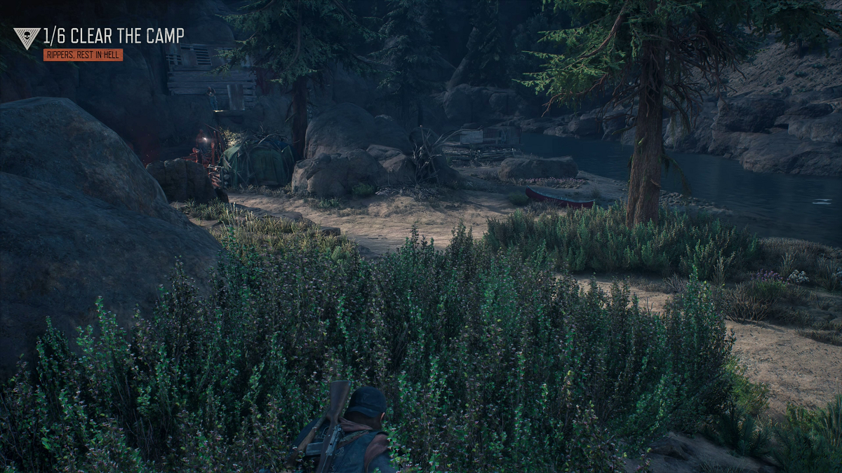 This mission is part of the Marauder Camp Hunter story line and takes place in the Hot Springs area. To get the mission started travel to Hot Springs Camp and talk to Tucker and she’ll give you the details. The Rippers have set up camp south of the Hot Springs Camp next to the Iron Butte Nero Checkpoint. To make things simpler you can leave the camp by the main entrance and turn left onto Black Crater Rd. , follow the road until you see the Nero sign that’s just after the bridge. Turn right, park your bike behind cover, and then sneak in on foot. The object at first is to clear 6 Rippers and this will be the case if you are quite and they don’t do too much shooting. There is plenty of bushes and cover in front of the camp to hide in. I took out the first 3 from my initial hiding spot and then advanced to the bushes in front of their club house. At this point I was still good with only having to take out 6, I prefer to use my crossbow because it’s silent and I have the knocked up skill that enables a 1 shot kill anywhere on their body on normal enemies. It looked to me like I got a head shot on the Ripper in front of me and the one after that but they didn’t go down and I had to shoot them a second time. This left only one Ripper and if I would have taken him out with a stealth attack the mission would have ended. But for some reason even though the ”R” was there I didn’t use it and made too much noise hitting him with my melee weapon, this resulted in 4 more Rippers to take out. I got the first 2 with no trouble but the last 2 had me kind of pinned down and I took quite a bit of damage moving to other cover. When you take out the last Ripper the mission will be complete, this one pays 4000XP, 1800 credits, 2300 point gain in camp trust, and the Marauder Camp Hunter and Ripped Apart story lines will be updated.