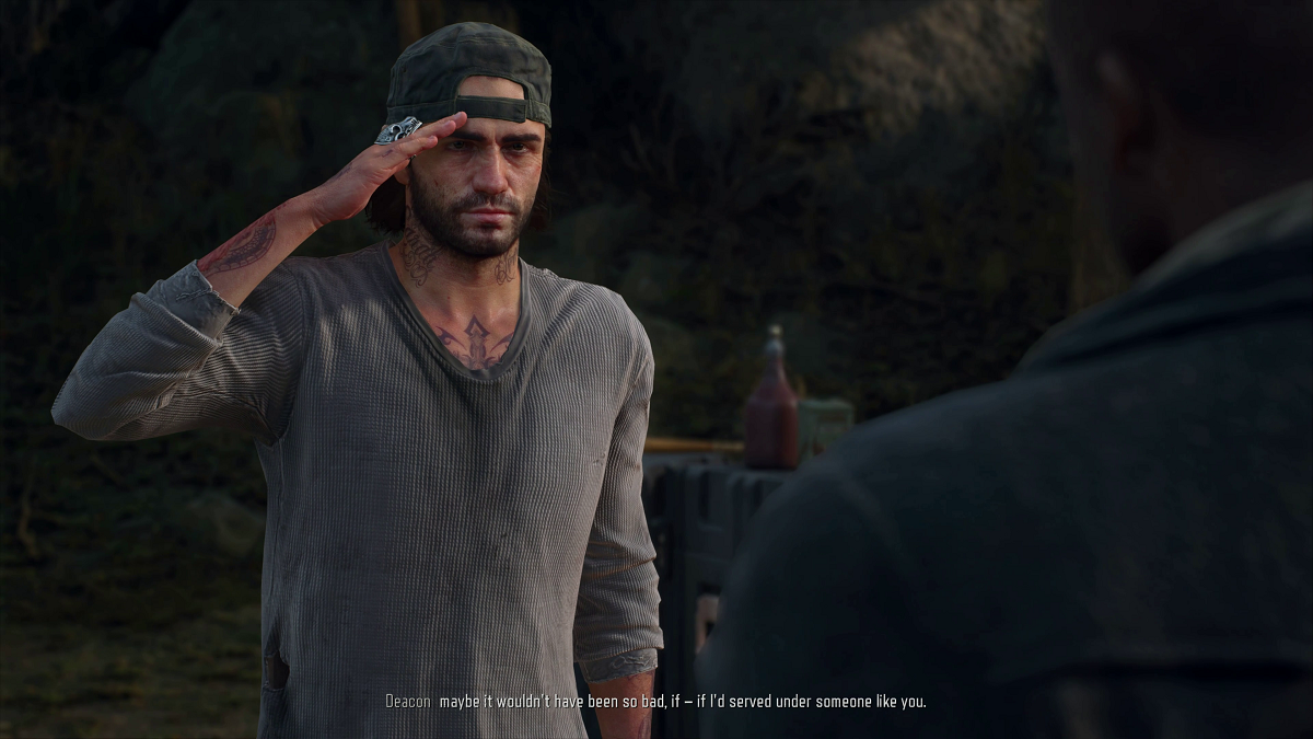 As Sarah and Deacon reach the top the Colonel is giving some new recruits a tour of the base, Skizzo is with the group and as soon as he see’s Deacon all hell breaks loose, the Nero helicopter makes a fly by but doesn’t land. The cut scene continues inside with the Colonel trying to find out what’s going on. In the end, because of Skizzo’s lies, Deacon is arrested and is to stand trial and hang the next day. The cut scene continues the next morning at a campsite away from the camp. Deacon wakes up to find himself with Captain Kouri and a small group of recruits. It turns out that Kouri didn’t believe Deacon deserves to hang for “trying to find his old lady” so he freed him from the camp. Kouri and crew are going A.W.O.L and heading to Reno and invite Deacon to go with them but Deacon has to warn Lost Lake Camp. The cut scene ends with Kouri and crew departing and also ending the mission Shadow Of Death.