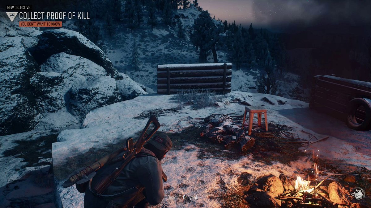 The second part is called You Don’t Want To Know, assuming you’re starting out from Wizard Island the recommended route has you going through the tunnel at the Volcanic Legacy Scenic Byway Nero Checkpoint. Once you’re on the Hwy 97 side take a left at the stop sign and follow the destination marker. The destination where your search for the Anarchist’s camp begins is a small campsite, there’s a couple of Anarchist’s there so if you can sneak a little closer than I did you might take them both out. In my case I used my crossbow from a distance and took one out but that spooked the other one and he got away. A search of the campsite will yield only loot but if you look at your map you’ll see a search area to the east. There are about 12 Anarchist’s in this camp counting the 2 at the first campsite. As you head for the search area you’ll probably run into a couple of Anarchist’s on patrol on the outside perimeter of the camp. There’s no good side to approach the camp because it’s on the high ground so I was noticed almost right away and when that happened there were a few more Anarchist’s that rode in. I was using my crossbow but it isn’t very effective at close range, I would’ve done better to use a suppressed main weapon or sidearm. I only got a few of them before I had to make a hasty retreat. Once I was in the bushes again I went back to my crossbow and accidentally shot one of them with a residue bolt which ended up taking the pressure off of me for the time being. When I thought they were all down I climbed up into their camp, as it turned out there was one last Anarchist. From about 15:50 to 16:03 in the video you can see a knife stuck into the tree with the magnifying glass symbol, I didn’t notice it until I reviewed the video while writing this post so I did the mission again to find out what it was, when you look closer at the knife foot prints will be revealed that lead up to another area to investigate that shows you how Meyers died. Anyway when the last one in down you’ll find Meyers up on the left or north side of the camp. Once you retrieve the Colonel’s Bible all you have to do is head back to Wizard Island which is sometimes easier said than done but in this case it was almost clear sailing all the way back. When you get close to the Colonel a cut scene will play as you give him the proof of kill and answer his questions, when the Colonel tells you to “carry on” the mission will be complete. At the end of the mission it didn’t list how much XP the mission was worth but looking at my map the mission details are as follows: 5000XP, 3500 credits, 1800 camp trust points. The Bounty Hunter story line will also be updated.