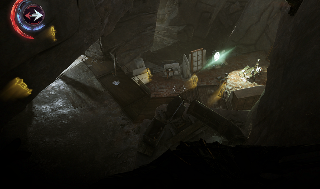 From the pipe above you can see the cultist that’s standing on the landing at the top of the stairs on the right, she’s filming the cultists below, so when she’s not filming she’ll turn and lean on the railing looking toward the walkway to the eye. I’m not sure if she would see you so to be on the safe side I waited till she started filming and then took out the first cultist looking over the railing. Then the cultist on the walkway. I hid both of them in the passage way that I used to get to this side, where the pipe is that comes from the piece of equipment outside the maintenance room.