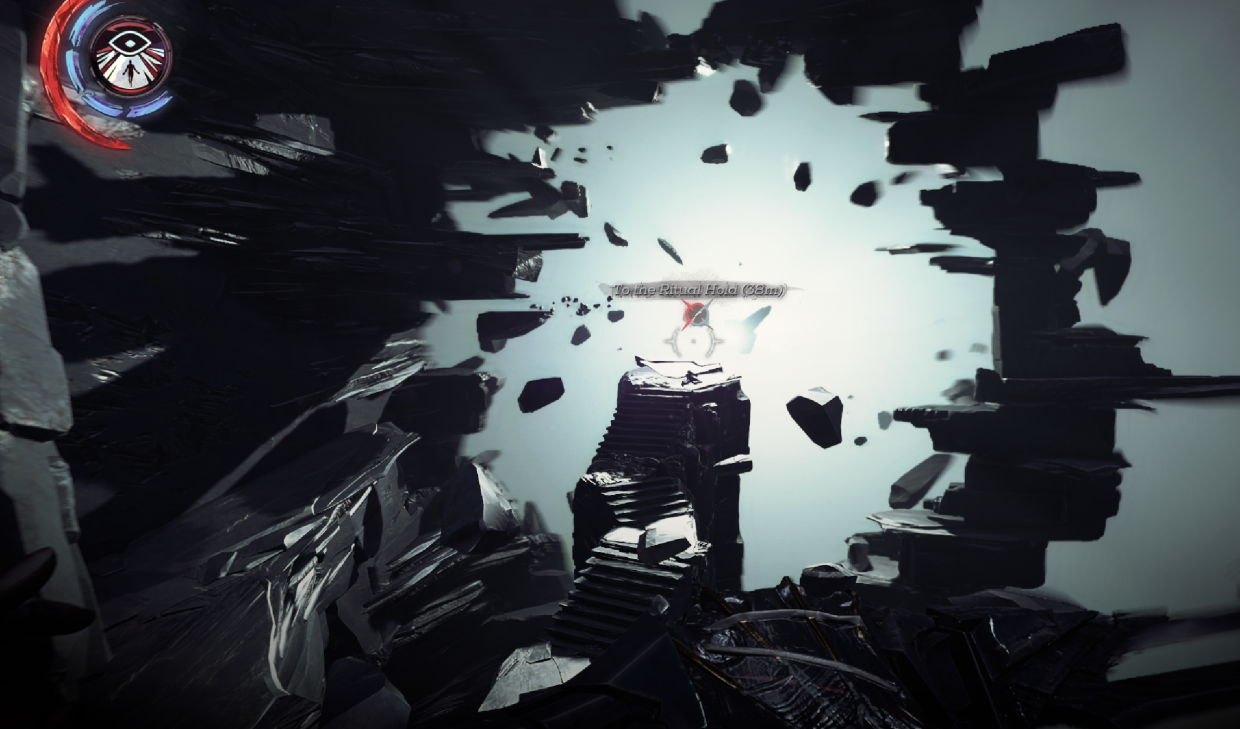 On the other side of the car go down the conveyor way on the right and make your way onto the roof through the broken window. There are 2 more void creatures patrolling the yard but you’ll be able to beam over onto the roof of the hoist room. From there just beam over to the left onto the rock stairs and into the ritual hold. It’s clear sailing from here on in just some decisions to make.