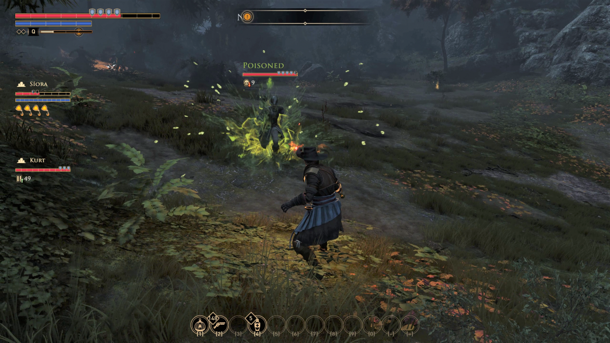The meeting point is on the right as you continue down the road. When you go to the meeting point and look around at the bottom of the tree an objective will appear and you’ll have to hide behind the rocks on the right, and as soon as you crouch down the captain and his conspirators will appear. When you confront the captain with the evidence that you found he’ll tell the others that they have to get rid of the nosey leget and with that the fight starts. I used poison traps that worked really well and by the time my companions had been knocked out I was left with just 2 enemies and neither of them had magic so that made it even easier. The fighting ends when the captain gives up and he agrees to have the Queens body transported to her village. You have a choice to travel directly to the village and that’s what you should do. I thought that there would be good loot to collect from the enemies but it turned out to be just a few coins.