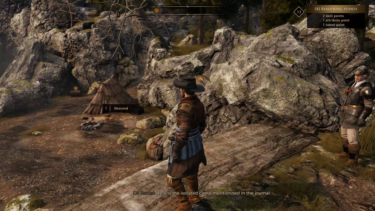 The location that you want to travel to is the valley of the great battle and the camp of the stone arch campsite. From there go left and either sneak around the beasts or take them out. There is a ledge on the right that leads up to another area with beasts, they are all sleeping so if you don’t want to take them out you can sneak past. The path that you want to take is on the left so if you get to the next group of beasts you’ve gone too far. The path on the left leads to another ledge and just beyond that is the campsite. A search of the campsite produces a journal page and a trail of blood. As you follow the trail of blood you eventually come upon another group of beasts and past the beasts at the end of the trail is a corpse. On the body you’ll find a chest key so take it and back track and go on the trail that went right past the beasts and that’s where the isolated camp is located. The chest is inside the camp and inside is Aphra’s journal so the search continues.