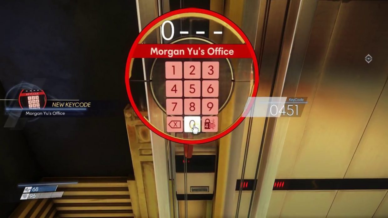 Making my way to my office was made easier with the use of turrets. When you’re watching the video of yourself walk right up to the screen and look left and you’ll see the safe code on the white board that was rubbed out in the simulation debriefing room that you were in in the area before coming into the lobby. once you know the code you just have to back track to the safe and loot what’s inside.