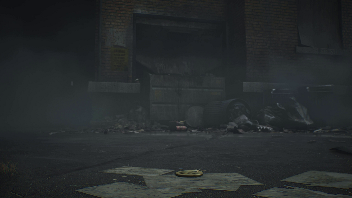 The sixth room is the laundry room. There’s ammo on the first washing machine to the left of the door. Along the wall across from the machines is a table with a six-pack of Bloody Apple Canned Juice. There’s also a chute door along the end wall with a white circle, so with the juice in hand, go to the chute. When James interacts with the chute, your inventory will come up. Select the six-pack, and James will put it in the chute. A short cutscene will play, showing the chute in the courtyard being forced open by the six-pack knocking the last coin loose and rolling into the courtyard. There’s a key in the laundry room door allowing you to exit into the hallway just up from the small staircase where the manual save is, so once again a great spot to stop, save, and prepare for the coin puzzle that lies ahead.