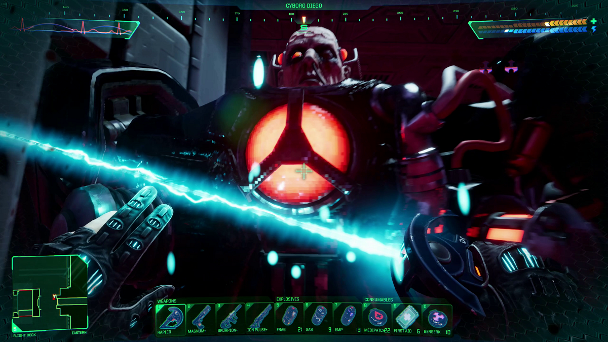 This time around I face off against Cyborg Diego again for a second time. As it turned out a Security 2 Bot showed up while I was waiting outside of Flight Bay 2 so I had to hide in one of Diego’s offices while I did my introduction for the video. Coming out of the office with my Rapier at the ready I made quick work of it. The Flight Bay is patrolled by 4 Security 2 Bots so carefully take them out before you jump down. The strategy to use for the Diego battle is to use your Rapier coupled with a Berserk Combat Booster patch and your Energy Projectile Shield on. As you approach the escape pod door Diego will come out triggering a brief cut scene rendering you powerless to do anything. So to insure that you will be within striking distance when he comes out, approach the door from one of the sides, I chose the north side. Even with my shield on I lost about two thirds of my health by the time the battle was over so he is a lot tougher this time compare to the first time. After the fight you can access the escape pods. Go in the door that Diego came out of, head down the ramp and chose one of the shuttle lifts. To get into one of the escape pods enter 001 into the keypad and the lift door will open, step inside and it will bring you into an escape pod automatically. Once inside the escape pod pull the lever on the console, this will trigger a short cut scene where you take a seat and a departure countdown starts. When the countdown reaches zero instead of blasting off the console shorts out and Shodan appears on all of the monitors. She will not allow you to leave after you have set the core to self destruct. So since the escape pod is no longer available head back into the Flight Bay. When you get there you’ll receive an email from Rebecca Lansing, in it she tells you not to panic, Shodan has started the Bridge separation sequence but it will take some time but when it happens you’ll need to be there. She also tells you they have a team of engineers who worked on Shodan and they’ll feed you information while you’re making you way to the Bridge. The rest of the email is lost when Shodan interrupts.