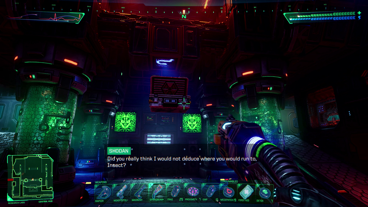 Make your way to General Control. When you enter stay at the top of the stairs. You’ll notice 4 Specimen containers, there are 4 Virus Mutants inside. When you walk down to go to the other side the 4 Mutants will be released. Now there’s a couple of ways to go about this. For the alternate way, you’ll need Gas Grenades. Don’t do it the way I did, I managed to get out of the room but just barely. Instead, turn on your Enviro-Pack. Enter the room and run over to the other side. Then go up into the Control Room. Go to the back of the room and fire the laser. You’ll know you were successful when the screen shows Shodan and the console reads “laser offline”. Now you can look through the Control room windows to see where the Mutants are. They’ll likely be one the lower floor again. So exit the Control room with Gas Grenade equipped and go to the top of the ramp. If there’s a Mutant there throw the grenade and retreat to behind the Control Room door. You should manage to get most of the Mutants this way. If one of them follows you up the ramp into the Control Room, then you’ll have to shoot them. The Magnum 2100 is a good weapon to use.
