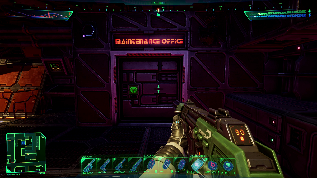 In this video, I enter the Maintenance Office, which holds various secrets and items crucial for your progress in the game. The Maintenance Office is conveniently located on the east side of the level. To find it, head down from the elevator, steer east along the south corridor, and keep an eye out for the door.