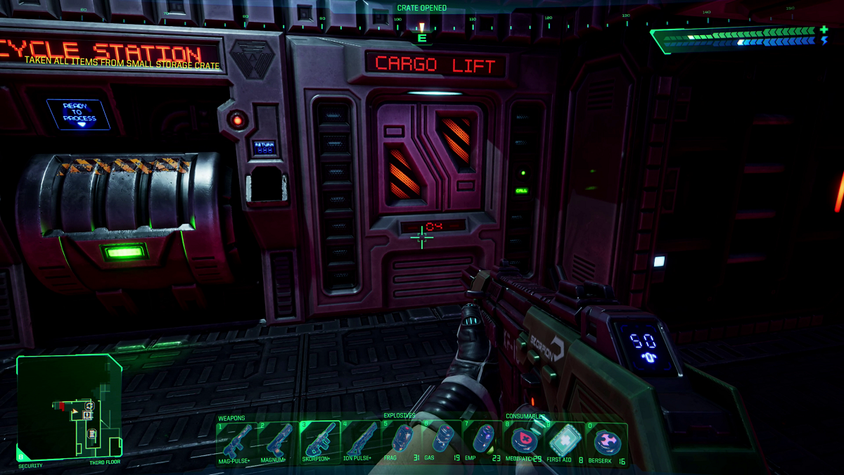 The Central Tower in the middle of the bottom floor is many stories high; there are cubbyholes at various heights on every corner. In these cubbyholes are stationed Cyborg Assassins and Striker Bots. The Cyborg Assassins are stationed on the west side of the tower. There are Mutated Cyborgs in every corner, and in the northwest corner, there are two. Effective weapons to use on the Cyborg Assassins and Mutated Cyborgs are the MK III Assault Rifle, the Ion Pulse, and the Magnum 2100 pistol. The Ion Pulse Rifle is also effective against the Striker Bots, bringing them down with three shots. The intermittent use of the Head Mounted Vision Unit will give you a more detailed look that is helpful to see the upper sections of the Central Tower. There is a Power Station in the northwest corner of the tower; there’s also a couple of battery packs by the filing cabinets and an audio log on the desk. The audio log is from Lonni Stevens; he’s talking about robots charging and lights dimming. This might be referring to the Repair Bay, but it is unclear at this point. In the northwest corner is an MK II Assault Rifle, and finally, in the southwest corner are the Recycle Station and the Cargo Elevator.