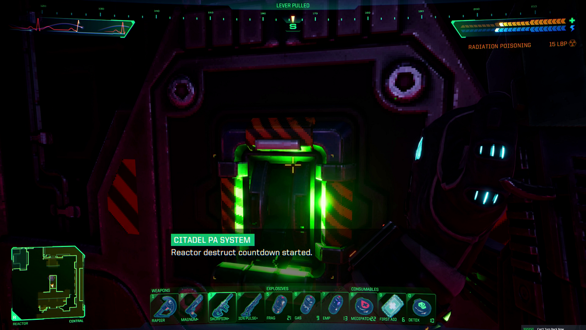 There are two main entrances to the Reactor Core, one along the north wall and one along the west wall. I chose to enter through the west wall entrance because it was close to the Power Station. Before going into the core, make sure you’re fully charged and your Environmental Protection Pack is turned on. It’s also a good idea to have health and detox patches assigned to hot bar slots. With that said, it’s time to enter the core. The walkway goes left on the other side of the door, you’ll discover that there’s a Security 1 Bot patrolling there, so lure it out and deal with it in the main corridor away from the contamination. Back in the core, follow the walkway to the corner and take a peek. There should be a Security 2 Bot there; it was at the far end when I did this, so it made it easier to take out. Around the corner, there’s a walkway on your right; there’s another Security 2 Bot there, so carefully take it out. Go down this walkway to the end, you’ll find a switch and an audio log on the desk terminal. The switch turns off the barrier to the repulsor lift that brings you up to the keypad. The audio log is from Marc Steinberg; in it, he’s talking about the reactor leaking radiation with spikes as high as 8 rems, but you already know there’s high radiation in the core. Backtrack to the main walkway and turn right; just up from the corner, there’s an open doorway to the core on your right. The self-destruct switch is behind a force field in the core. You’ll have to enter the code that was displayed in each of the CPU Node rooms after the nodes were destroyed, so jump down and ride the lift up. At the top, the keypad will be in front; before you start punching in numbers, move ahead off of the lift. This will make it easier to enter the code. The code for me was 763095; you’ll know you had the right code when the Citadel PA System announces, “Destruct security clearance accepted.” Now turn around and pull the switch; the Citadel PA System will announce, “Reactor destruct countdown started.” After that, there’s no reason to stay in the core, so head out of the contamination. On the way out, you’ll get an email from Shodan; she’s not happy and wants to know what you did? Impudent insect. If she dies, then she’ll avenge herself on you; her cybernetic children will feed on you, and you’ll be forgotten so that none will even remember your name. As a parting remark, she tells you to enjoy your victory for the rest of your short life. Empty threats to be sure, so to put your mind at ease, jump into the Surgery Machine and get your health refreshed.